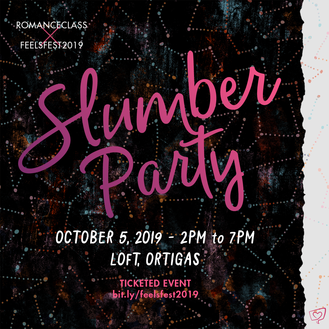 #FeelsFest2019 is upon us! Time to get cozy with #romanceclass – come in your best Slumber Party attire and curl up with readers, authors and live readers with all the feels October 5, 2019, 2-7pm, LOFT Coworking Space, Ortigas Center, Pasig City. Live readings + books, meet the authors and other readers and