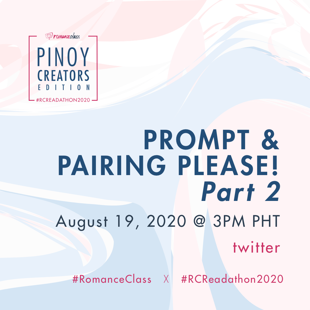 Challenge your favorite #romanceclass authors to write a 500-word (minimum) ficlet based on a prompt & pairing of your choice. Ficlet releases will be done every Wednesday at 3:00 PM PHT.