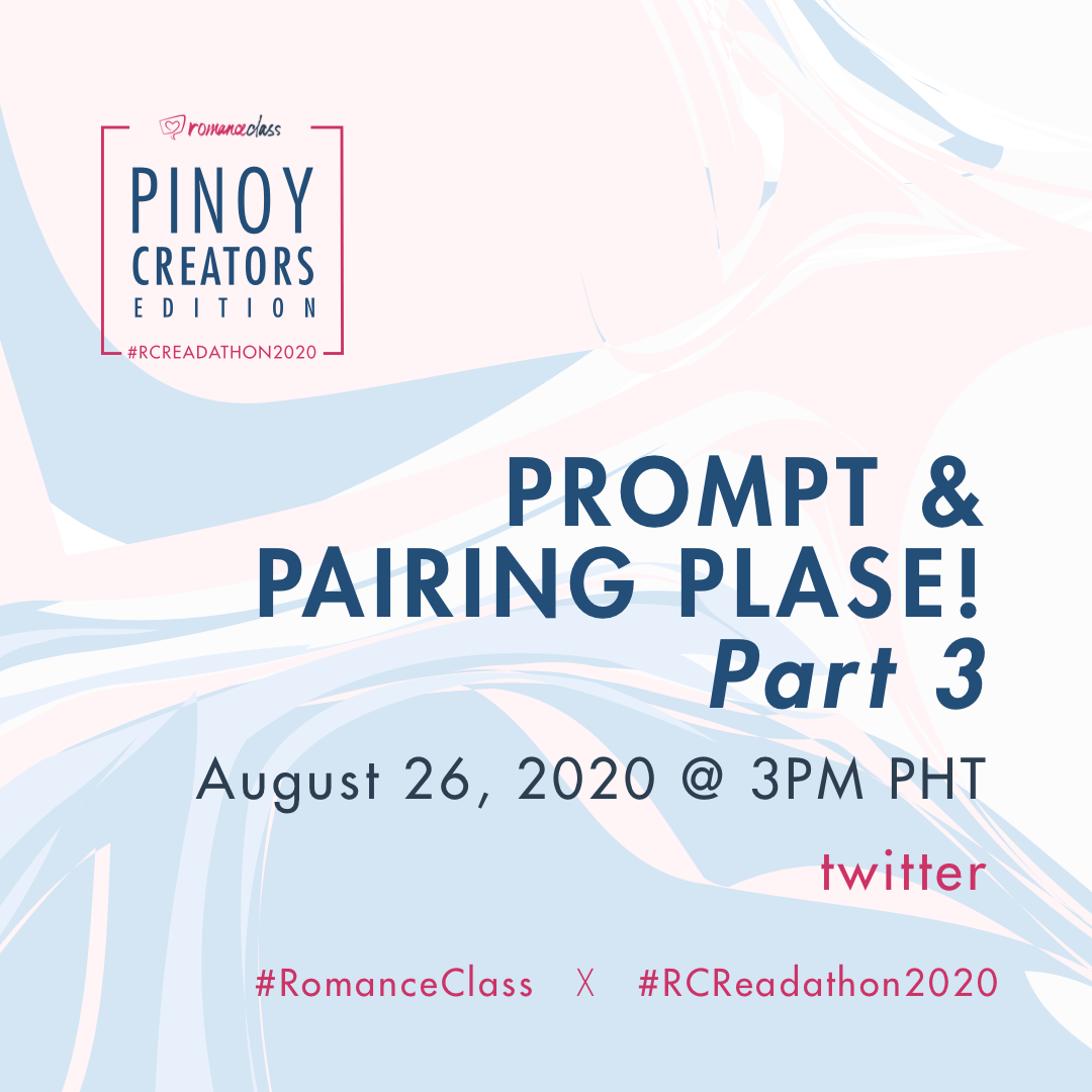Challenge your favorite #romanceclass authors to write a 500-word (minimum) ficlet based on a prompt & pairing of your choice. Ficlet releases will be done every Wednesday at 3:00 PM PHT.